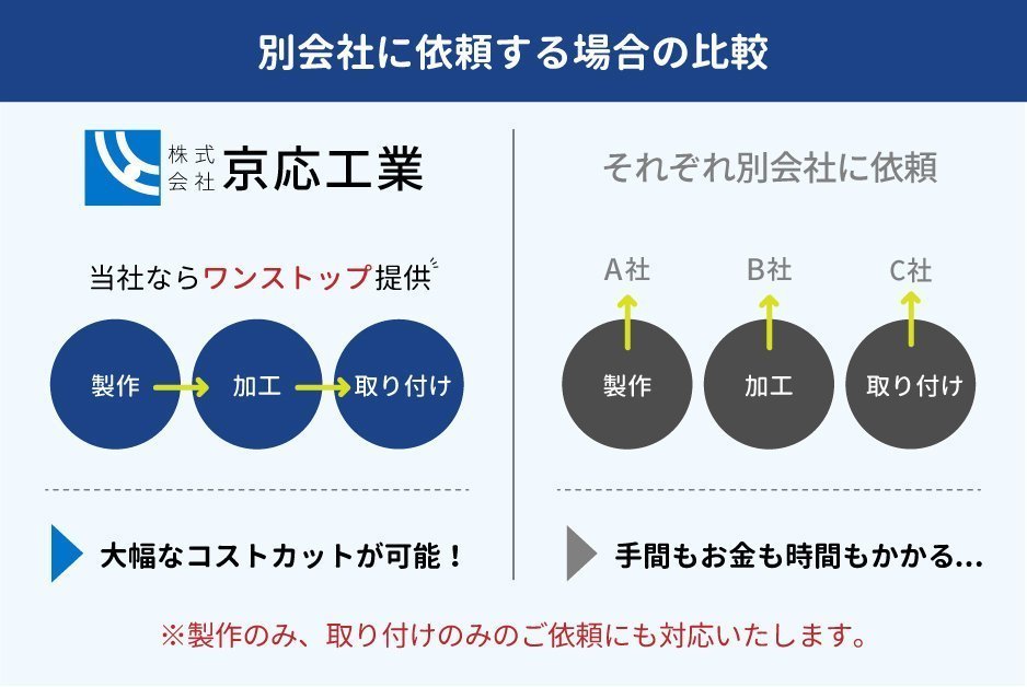 最初にご相談を受けてから要件をしっかりとヒアリングし、製作~取付までの全てを株式会社京応工業内でワンストップ提供することにより大幅なコストカットを実現しています。もちろん、製作のみでも取付のみでもご依頼いただくことが可能ですので、遠慮なくご連絡ください。